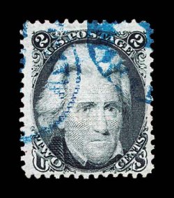 238 O 85B image#85B, 2c Black, "Z" grill, a visually striking used example of this very scarce and incredibly challenging stamp to find in any kind of collectable quality, as the great majority of known examples are poorly margined and have their design cut by perforations on at least one side, however the example offered here boasts enormously large margins all around and is quite well centered within these impressive borders, intense shade and strong impression on brilliant white paper, very attractive and unobtrusive blue town pmk., extremely fine for this issue; a choice used example of the Two Cent "Z" grill; 2001 PF certificate; ex-Sheriff. (Image) $1,300.00