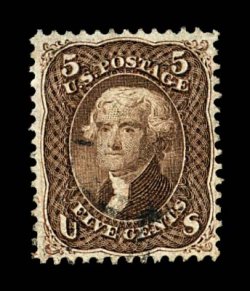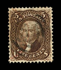 264 O 95 image#95, 5c Brown, "F" grill, exceptionally well centered and margined for this particular value, with all perforations clear of the design, rich luxuriant color, plus a strong detailed impression, very lightly cancelled leaving the face virtually cancel free, extremely fine; a surprising challenging stamp to find used this choice; 2004 PF certificate. (Image) $850.00