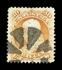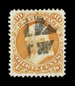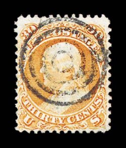 277 O 100 image#100, 30c Orange, "F" grill, a magnificent used single of one of the most challenging of all 19th century United States stamps to find in any kind of premium quality, as the vast majority are off center or with faults, this particular example, however, is wonderfully well centered within extravagantly large margins that are rarely encountered on this tightly-spaced issue, lovely rich color, bold circle of wedges cancel, extremely fine; a gem stamp for the most demanding collector; 2003 PF certificate. (Image) $850.00