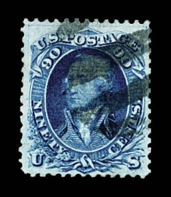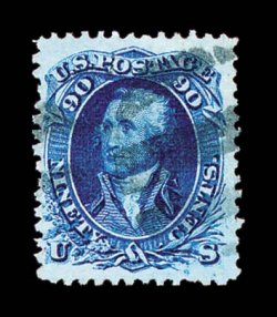 279 O 101 image#101, 90c Blue, "F" grill, handsome used example of this scarce high value grilled stamp, quite well centered within uncharacteristically large margins, especially vibrant color and a sharp impression on bright fresh paper, unobtrusive segmented cork postmark, very fine and quite choice; 1986 PF certificate; ex-Lyons. (Image) $1,750.00