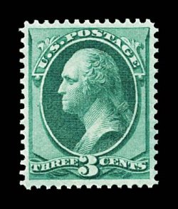 400 og 158 image#158, 3c Green, extraordinarily choice mint single, virtually perfectly centered amid margins much larger than typically seen, brilliantly fresh, with rich luxuriant color, intact and even perforations, full clean o.g., lightly hinged only once, extremely fine; seldom seen in this gem condition; 1999 PF certificate. (Image) $130.00