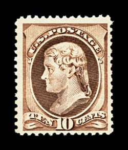 424 og 188 image#188, 10c Brown, with secret mark, an impressively well centered mint example of this very scarce stamp, with large margins all around, crisp even perforations surround the whole, sumptuously rich color and detailed impression, full o.g., lightly hinged, extremely fine; a stamp that is often missing in even advanced collections of mint U.S. stamps; 1991 and 2004 PF certificates. (Image) $2,500.00