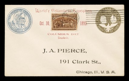 502 c 234 image#234, 5c Columbian, well centered single tied to J. A. Pierce illustrated Columbian Exposition envelope by Oct. 30, 1893 World's Fair machine cancel, fresh and extremely fine. (Image) Est. 200-300