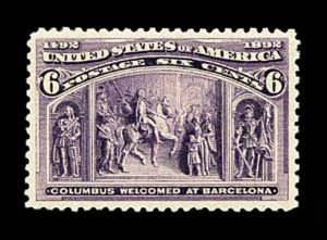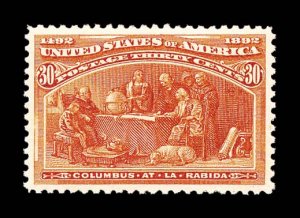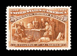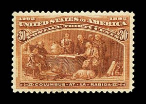 516 nh 239 image#239, 30c Columbian, the mint example offered here is the epitome of perfection, as every aspect of this stamp could not be improved upon, possessing mathematically precise centering amid very large margins, its color could not be more intense and deep, nor its impression more detailed on pristine paper, even its perforations are uniformly large and intact, immaculate o.g. without a single gum bend or skip, n.h., in a word - superb; 2004 PF certificate. (Image) $750.00