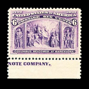 504 nh 235 image#235, 6c Columbian, bottom sheet-margin partial imprint single, well centered within extra-large margins, strong color, o.g., n.h., extremely fine; 1993 PF certificate. (Image) $195.00