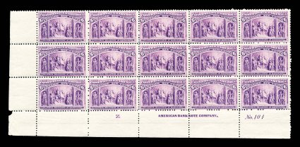 505 nhPB 235 image#235, 6c Columbian, bottom left imprint, letter "Z" and plate "No. 104" block of fifteen (5x3), strong rich color, o.g., n.h., a few selvage edge faults including a small tear at bottom right, fine appearance. (Image) $5,015.00