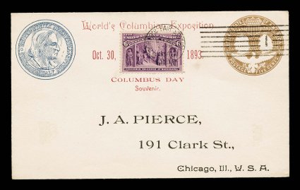 506 c 235 image#235, 6c Columbian, nicely centered single tied to J.A. Pierce illustrated Columbian Exposition envelope by Oct. 30, 1893 World's Fair machine cancel, fresh and extremely fine. (Image) Est. 200-300