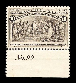 512 og 237 image#237, 10c Columbian, handsome mint full bottom sheet-margin plate "No. 99" single, excellent centering within uncharacteristically large margins for this value, fresh color, o.g., barest trace of hinging, extremely fine; 1985 APS certificate. (Image) $140.00