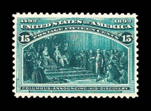 514 nh 238 image#238, 15c Columbian, brilliant "post office" fresh mint single, sumptuously rich color and a crisp detailed impression on immaculate paper, well centered, o.g., n.h., choice very fine; 1985 PF certificate. (Image) $625.00