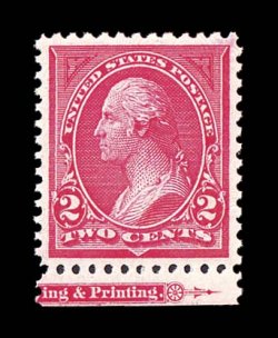 569 nh 265 image#265, 2c Carmine, Ty. I, gem bottom sheet-margin partial imprint single, incredibly well centered within very large margins, sumptuously rich color and impression, unblemished o.g., n.h., extremely fine; an especially eye-appealing stamp; photocopy of a 1999 PF certificate for an imprint and plate number strip of three from which this stamp was taken. (Image) $77.50
