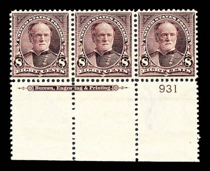 576 nh 272 image#272, 8c Violet brown, full bottom margin imprint and plate no. 631 strip of three, fresh color, o.g., n.h., fine-very fine. (Image) $675.00
