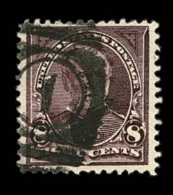 577 O 272a image#272a, 8c Violet brown, watermarked "USIR" in error, used, unusually well centered, deep luxuriant color, clearly identifiable letter "I" portion of the watermark, bold strike of duplex numeral "1" cancel, very fine and quite scarce; 2001 PF certificate. (Image) $850.00