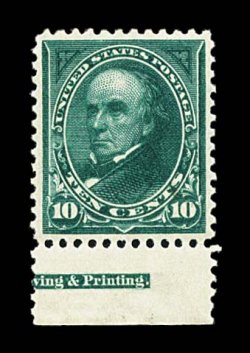 578 og 273 image#273, 10c Dark green, an impressive bottom sheet-margin partial imprint single, flawlessly centered within lavish margins, gorgeous rich color and a prooflike impression, o.g., very lightly hinged, extremely fine; 2002 PF certificate. (Image) $100.00
