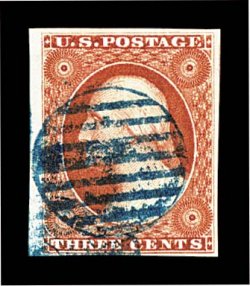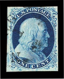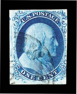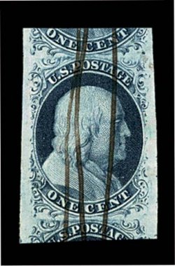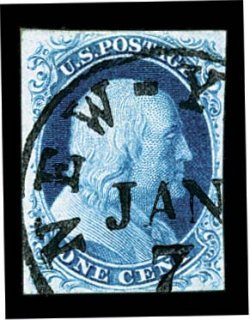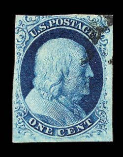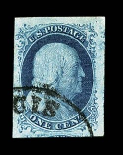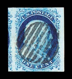 50 O 8A image#8A, 1c Blue, Ty. IIIa, an exceptionally handsome used single showing extra-wide break in the frame at top, well clear to large margins all around, wonderfully intense bright color and a prooflike impression, accented by a very neat and crisp portion of a black New York c.d.s., all making for an extremely fine and pretty stamp; 1998 PF certificate. (Image) $1,050.00