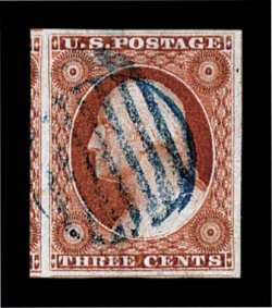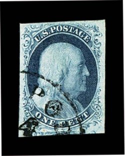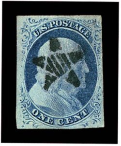 53 O 9 image#9, 1c Blue, Ty. IV, magnificent and perfect strike of black fancy segmented five pointed star of Barre, Mass. (S-E #ST-E2), being precisely centered on Franklin's head, stamp with margins virtually clear all around, very fine and a most impressive fancy cancel; Skinner-Eno notes that the period of use was 1857-61, thus certainly scarce on the imperforate issue as only a very late use of that issue would receive this cancel; 1989 and 1999 PF certificates; ex-Koppersmith. (Image) Est. 200-300