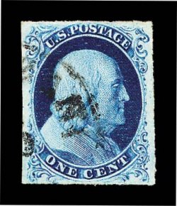 45 O 7 var. image#7 var., 1c Blue, Ty. II, pos. 9R4, an exceptionally scarce used example from plate 4, Ty. II stamps come only from the top row of this plate and are particularly rare imperforate, being nearly as rare as Ty. Ia which only comes from the bottom row of this plate, nearly four-margin example, with a very light cancel, both features allowing the stamp to be easily plated, intensely rich color distinctive to stamps from this plate, outstanding impression on bright paper, very fine and a truly rare stamp which is seldom offered. (Image) $1,100.00