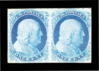 52 ng 9 image#9, 1c Blue, Ty. IV, handsome unused horizontal pair, possessing well clear to large margins virtually all around, showing small portions of the adjacent stamps above, pretty pastel color on bright paper and a highly detailed impression, extremely fine and attractive multiple. (Image) as two singles $600.00