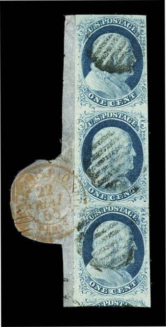54 O 9 image#9, 1c Blue, Ty. IV, attractive vertical strip of three, positions 14-34R1L, virtually full large margins all around, especially the bottom pair which is particularly well margined showing a portion of the next stamp below, each with central black grid cancels, and tied to small piece of cover by a red French maritime transit, very fine-extremely fine. (Image) $480.00
