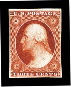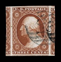 60 og 10 var. image#10 var., 3c Deep orange brown, a rare example of one of the most difficult stamps of the 19th century to find mint, especially in this deep orange brown shade which is as intense and deep as we have seen, prooflike impression, four clear to large margins including what is probably a portion of the top sheet margin, part o.g., accompanying certificate mentions light toned spots in the top margin which are totally inconsequential, not only because they are so light, but because most could be trimmed away and still leave a large margin, very fine; 1995 PF certificate specifically identifying this as the deep orange brown shade. (Image) $3,750.00