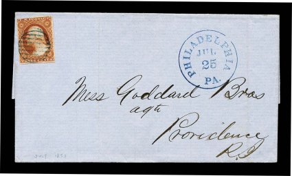 58 c 10 image#10, 3c Orange brown, plate 1, fresh single just tied to folded cover by blue circular grid, used in the first month after issuance, with lovely strike of blue "Philadelphia/Pa/Jul 25" c.d.s. at right, to Providence, R.I., stamp with bright color, three large to extra-large margins, showing the frame of the next stamp below, just in at top, very fine and attractive cover. (Image) Est. 200-300