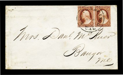 59 c 10 image#10, 3c Orange brown, horizontal pair, positions 71-72L0, possessing particularly rich orange brown color and impression, tied to cover to Bangor, Maine by "San Francisco/Cal/1 Oct" c.d.s. showing the 6c rate from west coast to east coast, margins mostly clear to large, just touching or slightly in at a few places, trace of cover soiling, otherwise a very fine and handsome cover; plate 0 is scarce, being in one state only and discarded after the orange brown printings. (Image) Est. 300-400