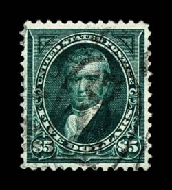592 O 278 image#278, $5.00 Dark green, highly select used example of this scarce high value, extraordinarily well centered within large margins, deep luxuriant color, considerably lighter cancel than typically found, extremely fine; an especially elusive stamp in this premium used condition; 2000 PF certificate. (Image) $550.00