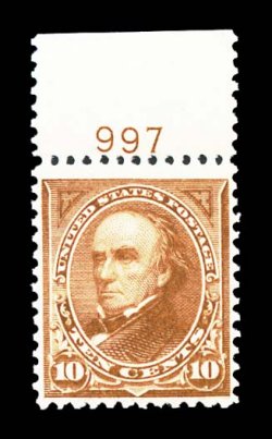 599 nh 283 image#283, 10c Orange brown, Ty. II, top sheet-margin plate no. 997 single, quite fresh and bright, rich color, well centered, o.g., n.h., very fine; photocopy of a 1989 PF certificate for an imprint and plate number strip of three from which this stamp was taken. (Image) $375.00