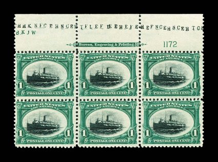 622 ogPB 294 image#294, 1c Pan-American, full top margin imprint and plate no. 1172 block of six, unusually fresh and crisp, deep luxuriant colors, clean o.g., lightly hinged in the top center stamp only, attractive fine centering. (Image) $250.00