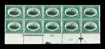 623 ogPB 294 image#294, 1c Pan-American, an incredibly choice full bottom margin imprint, arrow and plate nos. 1175, 1156 block of ten, extraordinarily well centered and margined throughout, brilliantly fresh and crisp, o.g., plate block of six is n.h., only one stamp in the arrow block is lightly hinged, extremely fine; plate blocks of this are seldom found in this premium condition; ex-Vreeland. (Image) $563.00