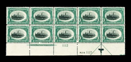 624 ogPB 294 image#294, 1c Pan-American, bottom margin imprint, arrow, and plate nos. 1112, 1117 block of ten, well centered, rich colors, o.g., l.h., very fine. (Image) $500.00