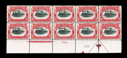 626 nhPB 295 image#295, 2c Pan-American, brilliantly fresh full bottom margin imprint, arrow and plate nos. 1114, 1135 block of ten, incredibly intense colors, strong and intact perforations, unusually well centered, pristine o.g., n.h., perf. disc indentation in top center stamp causing trivial edge tear, otherwise extremely fine. (Image) $850.00