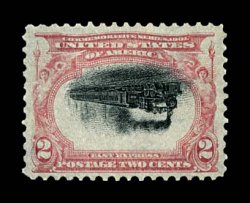 628 ng 295a image#295a, 2c Pan-American, Center Inverted, a wonderfully well centered unused example of this great invert rarity, possessing incredibly wide margins all around, as well as being surrounded by nice even perforations, attractive colors though accompanying certificates states slightly faded color, a phenomenon that for some reason is not that unusual for this, otherwise lacking the flaws that plague so many of this error, extremely fine.A very presentable unused example of this important 20th century error rarity, being among the finest centered and largest margined copies available. There were originally 200 of these inverts that passed through the Post Office, but the number of examples which still survive today has yet to be determined with certainty, as the Datz catalog estimates a total of 150 unused singles, a mint intact block of four and 3 to 5 used singles. However, there are other estimates by knowledgeable philatelists which place the number of surviving copies at less than half the Datz estimate. In any case, the immense rarity of this popular stamp is unquestioned.Despite the lack of gum, as most examples have disturbed gum anyway, this represents an exciting opportunity to acquire one of the great, and most recognizable, rarities of United States philately at an affordable level; 1997 and 2005 PSE certificates (Image) $42,500.00