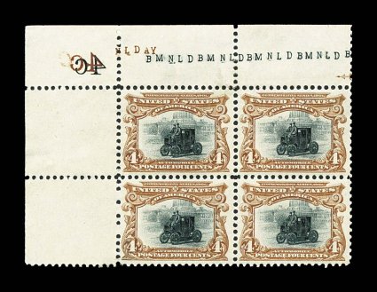 632 og/nhbl 296 image#296, 4c Pan-American, incredibly handsome top corner margin block of four with reversed "4c" of each color in the corner, fresh with bright colors, each stamp wonderfully well centered, o.g., accompanying certificate states bottom right stamp is never hinged, but the other stamps have at most a bare trace of hinging, extremely fine; 2004 PSE certificate. (Image) $445.00