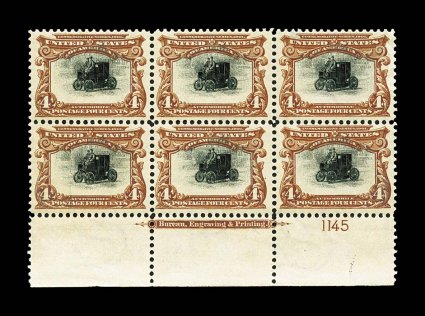 633 nhPB 296 image#296, 4c Pan-American, a magnificent quality full bottom margin imprint and plate no. 1145 block of six, each stamp within the plate being flawlessly centered and with large margins, strikingly intense colors, strong and intact perforations, unblemished o.g., never hinged, extremely fine; this gem plate block is one of the finest existing Four Cent Pan-American plate blocks. (Image) $3,500.00