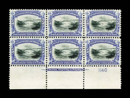636 nhPB 297 image#297, 5c Pan-American, highly select full bottom margin imprint and plate no. 1140 block of six, wonderfully bright and fresh, intensely rich colors, each stamp within the plate is exceptionally well centered and margined (a seldom seen occurrence on a plate block of this), pristine o.g., n.h., extremely fine; one of the few gem quality plate blocks we have ever encountered of this stamp; 1991 PF certificate. (Image) $3,750.00