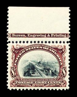 638 nh 298 image#298, 8c Pan-American, top sheet-margin partial imprint single, intensely deep colors and highly detailed impression on fresh white paper, nicely centered within large margin, o.g., n.h., extremely fine. (Image) $275.00