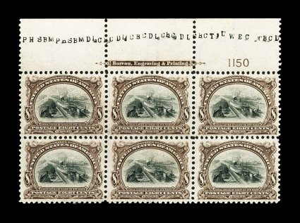 640 ogPB 298 image#298, 8c Pan-American, a most impressive quality full top margin imprint and plate no. 1150 block of six, featuring incredibly deep and luxuriant colors, plus its overall centering is quite select, marvelously fresh, o.g., lightly hinged, left vertical perfs. lightly and sensibly strengthened, extremely fine; a lovely example of this rare plate block. (Image) $4,000.00