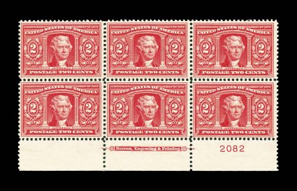 701 nhPB 324 image#324, 2c Louisiana Purchase, pristine bottom margin imprint and plate no. 2082 block of six, crisp and intact, well centered, strong rich color, o.g., n.h., very fine and choice; 1999 PF certificate. (Image) $450.00