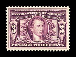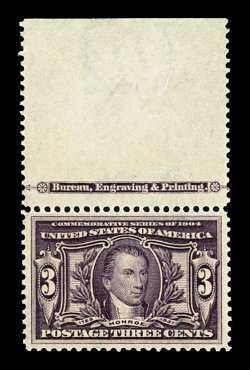 702 nh 325 image#325, 3c Louisiana Purchase, impressive full top sheet-margin imprint single, extraordinarily well centered within uncharacteristically large margins, rich color and impression, o.g., n.h., extremely fine and handsome; 2001 PF certificate; ex-Floyd. (Image) $200.00