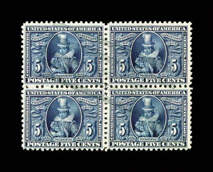706 Obl 330 image#330, 5c Jamestown, an incredibly well centered used block of four, all the more amazing as this issue is terribly challenging to find in a well centered single, let alone a block of four, lightly cancelled with grid of bars, deep color and sharp impression, extremely fine; 2003 PSE certificate. (Image) $210.00