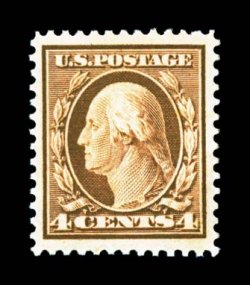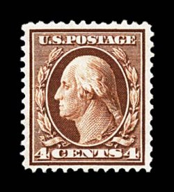 707 nh 334 image#334, 4c Orange brown, superbly centered amid lavishly large margins, rich luxuriant color and a razor-sharp impression, o.g., n.h., an extremely fine gem for the perfectionist. (Image) $90.00
