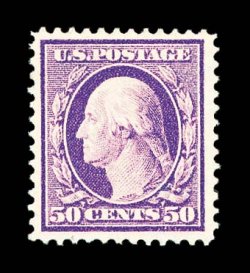 713 nh 341 image#341, 50c Violet, a "post office" fresh mint example, featuring especially deep and luxuriant color, crisp detailed impression on bright paper, well centered within large margins, unblemished o.g. without a single gum bend or skip, n.h., extremely fine overall; a terribly difficult stamp to find both this choice and never hinged; 1984 PF certificate. (Image) $750.00