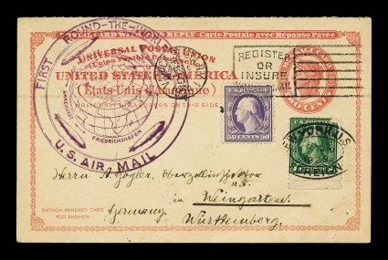 715 c 341 image#341, 50c Violet, attractive single with bright color and fine centering, tied to message portion of 2c Red postal reply card (#UY11m) by New York machine cancel, plus additional 1c Green (#498; small corner scuff) tied by New York oval, flown on the 1929 Round the World flight of the "Graf Zeppelin", addressed to Wurttemberg, so flying the leg Lakehurst to Friedrichshafen, apparently returned to the sender using the reply portion (not present) as registry c.d.s. of Aug. 30th and Sept. 1st of Missouri and Texas respectively are found on the reverse, violet United States flight cachet, very fine Zepplin usage; the use of the 50c on cover is a great rarity (Scott catalog value $5,000.00), despite being used 20 years after issuance this is a proper postally used example; a wonderful and affordable opportunity to acquire this stamp on cover, the few used during the period being rarely available . (Image) Est. 400-500