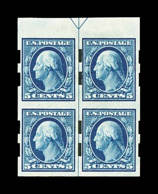 719 ogbl 347 var. image#347 var., 5c Blue imperforate, Schermack Ty. III perforations, very fresh top sheet-margin arrow block of four, well margined, o.g., choice very fine; a very scarce position multiple; ex-Agris. (Image) Est. 200-300