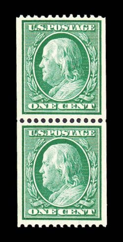 720 nh 348 image#348, 1c Green coil, perf. 12 horiz., select mint pair, marveloiusly well centered within large margins, prooflike color and impression, unblemished o.g., n.h., extremely fine; a gem pair of this early issue. (Image) $210.00