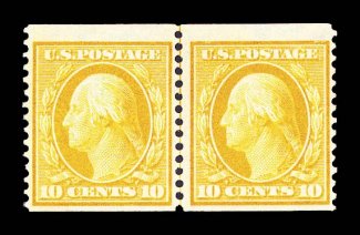 741 og 356 image#356, 10c Yellow coil, perf. 12 vert., a highly desirable guide line pair of this coil rarity, possessing a marvelous overall freshness, with sumptuously rich color in an especially deep shade, wonderfully well centered, particularly clean o.g., lightly hinged, very fine and quite choice; a line pair with exceptional eye appeal; 1991 PF certificate. (Image) $13,000.00