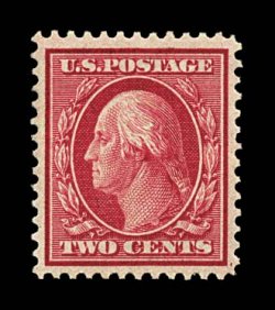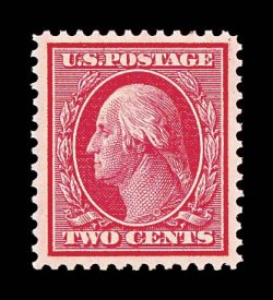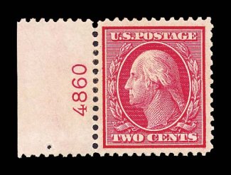 743 nh 358 image#358, 2c Carmine on bluish paper, an incredibly choice left sheet-margin plate no. 4860 single, perfectly centered amid extravagantly large margins, deep luxuriant color, o.g., never hinged, extremely fine; actually a challenging stamp to find in this gem quality; 1987 PF certificate. (Image) $180.00