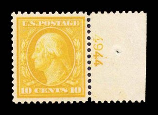 750 og 364 image#364, 10c Yellow on bluish paper, an incredibly fresh and choice mint right sheet-margin plate no. 1944 single, featuring outstanding centering amid extravagantly large margins which are most uncommon to this value, wonderfully intense and brilliant color on immaculate paper, especially even and intact perforations all around, full clean o.g. that has been only lightly hinged, extremely fine; a gem example of the Ten Cent Bluish Paper; 1994 PF certificate. (Image) $1,850.00