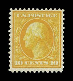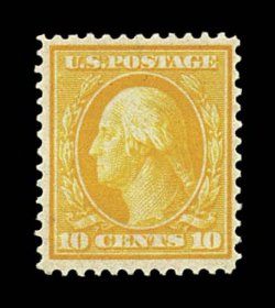 751 og 364 image#364, 10c Yellow on bluish paper, incredibly bright and fresh mint single, featuring absolutely radiant color on crisp paper, well centered, pristine full o.g. which has been lightly hinged only once, very fine and choice; photocopy of a 1978 PF certificate for a block of four, this being the bottom left stamp, plus a 2002 PF certificate as a single; ex-McKinney. (Image) 1,850.00