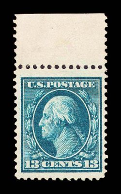 753 og 365 image#365, 13c Blue green on bluish paper, a spectacular quality top sheet-margin mint example, possessing margins of immense size, unlike any other example of this value we have ever seen, and being extraordinarily well centered amid these lavish borders, gorgeous intense color and a crisp detailed impression on bright paper, especially clean o.g. which has been only very lightly hinged, extremely fine; a gem Thirteen Cent Bluish Paper that certainly ranks among the finest available; 1954 and 2001 PF certificates. (Image) $3,000.00